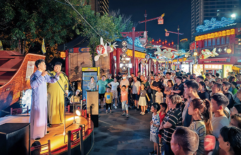 从剧场到街巷,天津的文化惠民活动正以愈发生动丰富的姿态浸润人心。图为2025年8月1日晚,市民和游客在天津市南开区古文化街旁的潞河督运巷观看相声演出。潞河督运巷于今年年初开街,以大运河文化为主线,讲述天津城市起源和历史文化变迁,再现200多年前的天津街景。 中新社记者 佟郁/摄