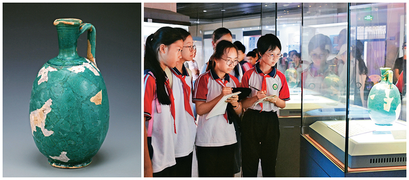 2017年,习近平总书记来到合浦汉代文化博物馆考察时指出,向海之路是一个国家发展的重要途径,这里围绕古代海上丝绸之路陈列的文物都是历史、是文化。要加强文物保护和利用,加强历史研究和传承,使中华优秀传统文化不断发扬光大。左图为合浦汉代文化博物馆的镇馆之宝——东汉波斯陶壶。这是迄今为止我国出土年代最早的一件波斯陶壶,也是汉代海上丝绸之路的重要物证。右图为2024年4月,当地学生在研学活动中参观波斯陶壶。 广西壮族自治区党委宣传部供图