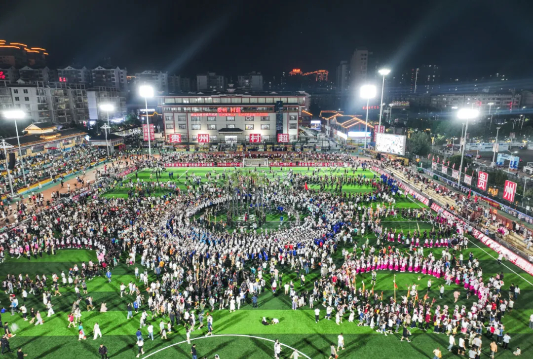 近年来,各地巧妙融合体育竞技、民族文化与文旅消费,撬动乡村流量与经济增量,赋能乡村振兴。2025年8月23日,首届“村超”全国赛总决赛在贵州省榕江县“村超”球场举行。图为当日人们在球场跳苗族芦笙舞。 新华社记者 杨文斌/摄